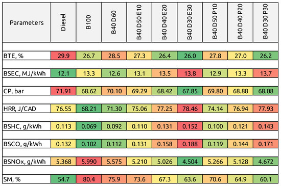 A heat map comparing the observed results is illustrated in Figure 11. To select an optimum blend, ternary fuel blends exhibiting the highest BTE are considered the primary selection criteria. The engine operation using B40D50E10 and B40D50P10 exhibits superior BTE in terms of performance among other ternary blends tested. However, even though higher alcohol blending rates in ternary fuel blends showed a proportional increase in HRR, values of CP were seen to decrease. In this study, both the values of CP and HRR for B40D50E10 and B40D50P10 fuels are closer to the values obtained with diesel fuel. When comparing emission characteristics, both SM and BSNOX are seen to lower with higher alcohol blending rates in ternary fuel blends, but BSHC and BSCO are observed to raise proportionally. Similarly, the ternary fuels B40D50E10 and B40D50P10 provide the best trade-off, with values for BSHC, BSCO, and BSNOX lower than the results seen with diesel fuel engine operation. However, although the SM values obtained with B40D50E10 and B40D50P10 fuels are higher than diesel, they are lower when compared to the values obtained with B100 and B40D60. In this regard, ethanol and propanol-based ternary blends having alcohol at a 10% volumetric concentration are found to be most suitable for engine application.