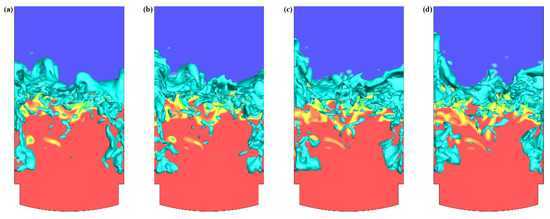 Profile of slag splash height process: (a) t = 6.10 s, (b) = 6.15 s, (c) = 6.20 s, (d) = 6.25 s.