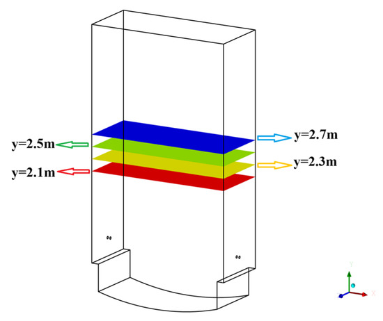 To illustrate the effect of different lance immersion depths on the slag splash height, four working conditions are constructed, varying the immersion depth of the side blow lance. At the same time, considering the research content of Section 4.2, the injection velocity of the lance is set to 160 m/s in this section. The specific parameters are shown in Table 3.