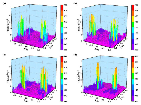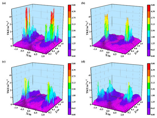 TKE distribution on y = 2.5 m section, (a) immersion depth 0.00 m; (b) immersion depth 0.04 m; (c) immersion depth 0.08 m; (d) immersion depth 0.12 m.