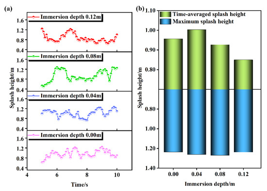 The variation of splash height with time and the average splash height for the four different immersion depth conditions are counted separately. Since the parameters of working condition 6 are the same as those of working condition 3, the data obtained are also identical. The specific results are shown in Figure 8.