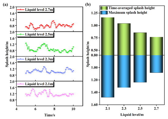 - As the initial liquid level increases, both the time-averaged splash height and the maximum splash height of the slag decrease gradually. At the initial liquid level of 2.7 m, the time-averaged splash height of the slag is 0.77 m, and the maximum splash height is 1.08 m. The maximum TKE of the slag decreases significantly with the growth of the initial liquid level.