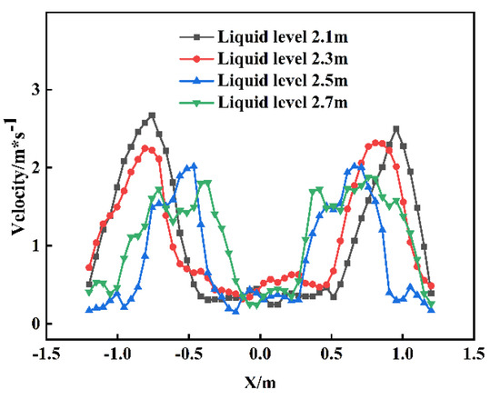 According to Figure 10b, with the increase in the liquid level, the time-average splashing height of slag is 1.16 m, 1.04 m, 0.85 m, and 0.77 m, respectively. The maximum splash heights of the slag are 1.48 m, 1.32 m, 1.24 m, and 1.08 m, respectively. Obviously, both the time-averaged and maximum splash heights decrease as the initial liquid level grows. Increasing the initial liquid level of the melt pool could extend the length of the bubble uplift path. The longer the uplift path, the more contact time between the slag and the bubbles. For working conditions 9 and 10, the time-averaged and maximum splash heights are large for both conditions. This is due to the short uplift path of the bubbles, which in turn leads to insufficient contact time between the bubbles and the slag, and the bubbles still have a high velocity when escaping from the slag surface. Figure 11 shows the velocity of the bubbles when they float up to the initial liquid level for working conditions 9 to 12. In the exploration conditions, the distribution of velocity shows an “inverted W” distribution. The maximum velocities for the four working conditions are 2.67 m/s, 2.32 m/s, 2.02 m/s, and 1.88 m/s, respectively. Obviously, increasing the initial liquid surface height can effectively extend the upward path length of the bubbles. Further, it would increase the contact time between bubbles and slag and reduce the velocity of bubbles when escaping. Ultimately, the effect of slag splash suppression is achieved.