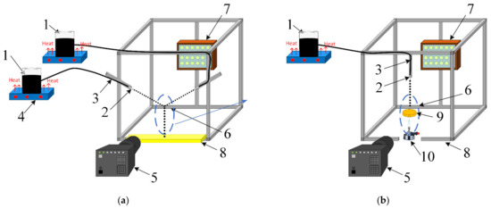 Scheme of experimental setup for droplet–droplet collisions (a) and droplet impingement on solid substrates (b): 1—fuel container; 2—fuel feeding nozzle; 3—fuel oil/water emulsion feeding pipeline; 4—magnetic stirrer; 5—high-speed video camera; 6—collision area; 7—spotlight; 8—collector of liquid fragments; 9—substrate; 10—gas burner.