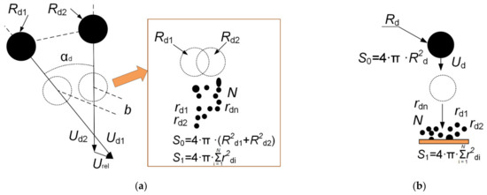 To calculate the distance between the droplets’ centers of mass (b) at the moment of approach, the vector of their resultant velocities was marked off from their centers of mass (Urel = (Ud12 + Ud22 − 2·Ud1·Ud2·cos(αd))1/2) (Figure 2). The parameter b is a segment perpendicular to the vectors marked off in parallel to the resultant velocity vector. Therefore, the linear impact parameter (B) reflects the droplet sizes and velocities, the impact angle, and the distance between the droplets’ centers of mass. The linear impact parameter is a dimensionless linear parameter of a collision describing the centricity of impacts of the droplets. The value B = 0 corresponds to a frontal collision and B = 1 corresponds to a tangent collision. The parameter B is determined before the collision and is the distance b between the centers of two droplets in a plane perpendicular to the relative velocity vector, and is normalized to the average droplet diameter [57]. The impact angle in binary collisions of droplets has a significant effect on the resulting velocity of interaction between droplets. This effect is considered when calculating the resulting droplet velocity using the least-squares method. The highest kinetic energy during the collision of droplets corresponds to impact angles close to 0° and 90° [60]. In this case, the contact area of the droplets is a maximum, their kinetic energy is also a maximum, and the interaction proceeds intensively due to internal shear stresses.