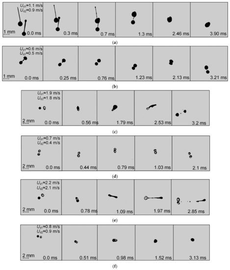 Images of droplet–droplet collisions (T ≈ 80 °C): (a)—coalescence of fuel oil droplets; (b)—bounce of fuel oil droplets; (c)—disruption of two-component fuel droplets (90 vol% fuel oil, 10 vol% water); (d)—bounce of two-component fuel droplets (90 vol% fuel oil, 10 vol% water); (e)—disruption of fuel oil droplets colliding with water droplets; (f)—coalescence of fuel oil and water droplets.