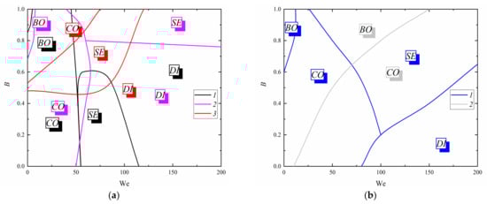 Figure 5 and Figure 6 show typical collision regime maps in the coordinate systems accounting for the dimensionless linear interaction parameter, as well as the Weber and Reynolds numbers. The dimensionless linear interaction parameter accounts for the distance between the droplets’ centers of mass and collision centricity. This regime map was used to present the four collision regimes in one coordinate system for each fuel composition. It showed the conditions in which one can ensure stable droplet disruption, i.e., their extensive secondary atomization. The maps indicate the boundaries for the four droplet collision regimes: bounce, separation, coalescence, and disruption. The regime maps have similar shapes to those obtained for the collisions of milk [54], hydroxypropyl methylcellulose aqueous solutions (2%, 4%, and 8%) [63], water, and diesel oil droplets [64]. The transition boundaries between regimes are in acceptable agreement. The absolute values of critical Weber numbers, impact parameters, and other criteria differ due to a significant difference of liquid properties.