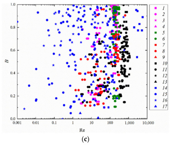 Collision regime maps of typical compositions accounting for the dimensionless linear interaction parameter: (a) 1—CWS (30 wt% coal, 70 wt% water) [41]; 2—two-component fuel (30% transformer oil, 70% water) [41]; 3—CWSP (30 wt% coal, 25 wt% transformer oil, 45 wt% water) [41]; (b) 4—water [41]; 5—fuel oil; (c) 1–4—CWS (30 wt% coal, 70 wt% water) [41]; 5,6—two-component fuel (30% transformer oil, 70% water) [41]; 7–9—CWSP (30 wt% coal, 25 wt% transformer oil, 45 wt% water) [41]; 10–13—fuel oil; 14–17—water [41]; 1,5,7,10,14—disruption; 2,6,8,11,15—coalescence; 3,12,16—bounce; 4,9,13,17—separation.