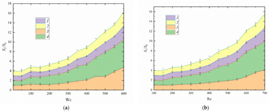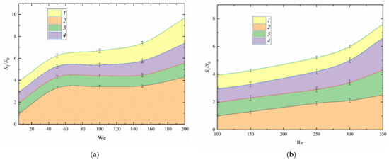 Liquid surface area ratio against Weber number (a) and Reynolds number (b): 1—water [51]; 2—slurry (30 wt% coal, 70 wt% water) [51]; 3—two-component fuel (30 vol% transformer oil, 70 vol% water) [51]; 4—two-component fuel (90 vol% fuel oil, 10 vol% water).