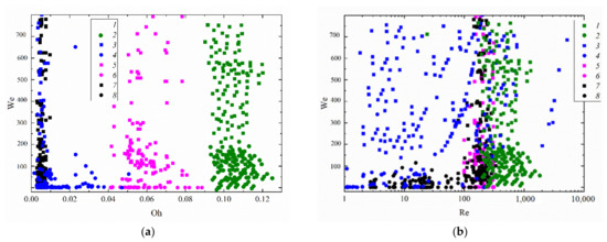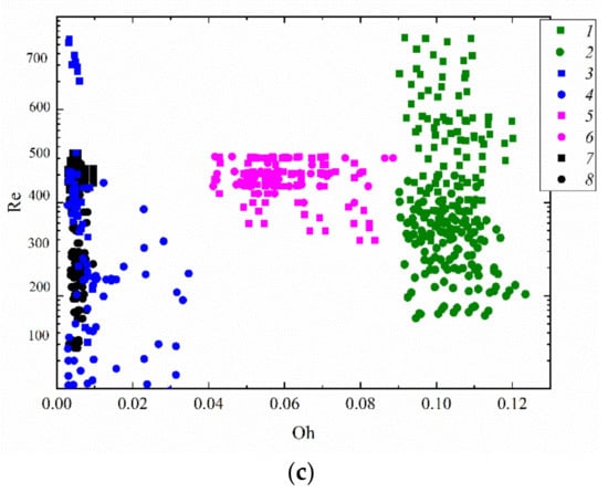 Using We(Oh) and Re(Oh) interaction regime maps, one can single out the variation ranges of the Reynolds, Ohnesorge, and Weber numbers (Figure 5a,c), in which there was a relatively stable occurrence of not only disruption and coalescence but also separation and bounce. Transition zones between regimes are of special interest. In these ranges, the factors that are normally neglected play an important part, for instance, the droplet shape, head-on or off-center collision trajectories, etc. Such conditions can only be scrutinized as part of a comprehensive evaluation using three- or even multi-dimensional coordinate systems.