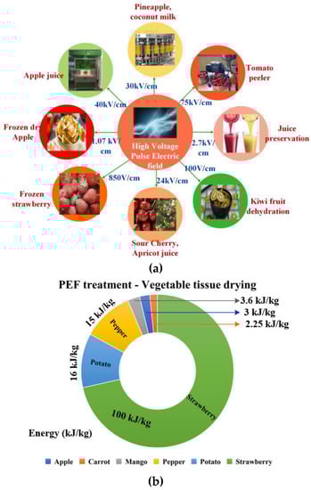 Recently, modern technologies have been introduced to the food processing industries to retain the nutrients in the food when it is processed. For example, moisture extraction processes to inhibit the deterioration and dehydration of vegetables and fruits have been modernized. Thermal drying, osmotic dehydration and vacuum infusions are some of the methods of dehydration. As a substitution to traditional food processing methods, non-thermal food processing techniques have gained a wide range of popularity and serve as a potential tool in fruit preservation. As a non-thermal method in food preservation, Pulsed Electric Field technology involves short electric pulses for the inactivation of micro-organisms and the dehydration of fruits and the preservation of their vital quality and nutrition. Pulsed Electric Field (PEF) stands as a low cost and low energy technology for the cell membrane permeabilization of fruit tissues [,]. The PEF maintains the basic structure of food without thermal degradation and a significant temperature rise [,]. The benefits of PEF in large scale food industry application as a standalone process, and also as a combination with various methods for the acceleration of fermented food are discussed [].
