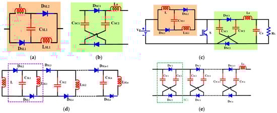 (a) SLcell; (b) SC cell; (c) PSLSC converter topology with single SL and SC cell; (d) Cascaded structure of Switched Inductor cell; (e) Cascaded structure of Switched Capacitor cell.