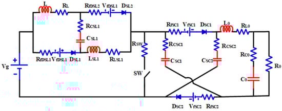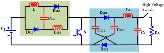 DC–DC converters of the non-isolated type are therefore used where the galvanized isolation is not in need. A high voltage gain is also achieved with a reduced cost and size. Quadratic boost [], voltage shift [], capacitor-diode voltage multiplier [], switched-inductor and switched capacitor [] based boost converters are some of the non-isolated boost topologies with high gain. The efficiency of a boost converter can be increased in many ways. The cascading of converter stages can increase the voltage gain. An issue of instability and control circuit complexity occurs due to an increase in the component count in cascaded cycling []. The gain can be increased by increasing the number of switched inductor and switched capacitor cells. Though there is an increase in the component count in this combination of switched inductor and switched capacitor, they have their own advantages. The leakage reactance stored energy can be absorbed by switched capacitors. No additional snubber circuit is required. To reduce conduction loss, MOSFET with low on-state resistor is suggested for selection []. A suitable converter topology efficiently boosting a low input voltage to a high output bus voltage is discussed and experimentally verified in [,]. To alleviate the reverse recovery problems and stress on diodes, Schottky diodes are used and a prototype designed for 40 W is experimentally verified for the converter performance []. With a simple topology, a high output voltage obtained with a low duty ratio can be easily obtained just by increasing the number of inductor cells of the circuit topology. The results are analyzed experimentally []. Another topology, applying the same gating pulses for the two switches, is proposed efficiently to obtain a high conversion ratio with a reduced loss on the converter and experimentally validated [,,,,,,,,].