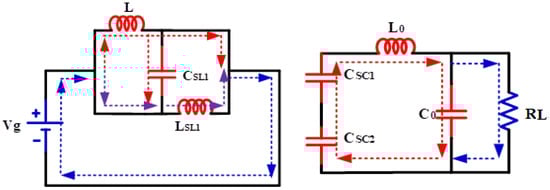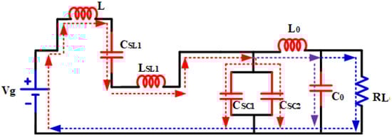 The switch ‘SW’ conducts at t = t0. Diodes DSL1 and DSL2 are forward biased. The inductors ‘L’ and ‘LSL1’ are excited by the input DC source Vg. The inductors ‘L’ and ‘LSL1’ are connected in parallel with capacitor CSL1. The DC energy source is transferred to the inductor ‘L’. The current Ig is equal to the accumulation of the currents IL, ILSL1 and ICSL1. The capacitors CSC1 and CSC2 are connected in series with inductors L0 as the two diodes DSC1 and DSC2 are reverse biased and supply the load resistance RL. Figure 4 shows the flow of current in the converter circuit during this interval.