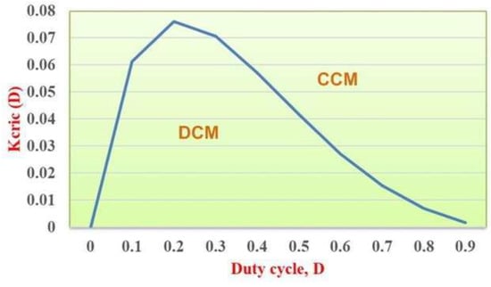 The boundary between CCM and DCM is BCM. While the converter proposed operates in BCM, the gain of CCM and DCM are equal. The critical value of ‘K’ obtained is given in Equation (29). Figure 8 shows the curve of ‘Kcrit’ in terms of ‘D’. At the boundary of DCM and CCM, the converter operates in a condition where K=Kcrit. When K>Kcrit, the converter functions in CCM ( and when K<Kcrit the converter functions in DCM .