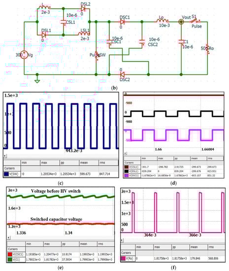 The proposed topology waveforms are given in Figure 6a,b. Figure 6a shows the wave forms of voltages depicting the gate pulse of switch ‘SW’, VCSL1, VDSL1, VDSL2, VCSC1, VCSC2 and VSW from top to bottom. Figure 6b shows the wave forms of currents that are related to gate pulse of switch ‘SW’, ILSC1, IL0, Vg and VOUT from topmost to bottom.