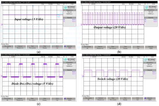 From the results obtained from the prototype, it is more obvious that the scaled down prototype generates the desired voltage required for the mentioned application. It generates the pulse with the width of 10 µs and a repetition rate of 500 per second. The operation of switched inductor cell is validated with the results obtained across the L and LSL1. This is verified with the results illustrated in Figure 13e,f. These two inductors are parallelly charged and discharged serially at the ON and OFF conditions of the switch.