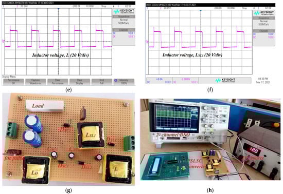 (a) input voltage; (b) output voltage; (c) diode voltage; (d) switch voltage; (e) inductor L voltage; (f) inductor LSL1 voltage; (g) converter setup; (h) entire setup.