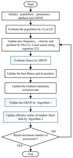 In our work, we proposed an improved general regression neural network surrogate-assisted adaptive bat algorithm (GARCBA) for LED problems. Figure 1 shows a flowchart of our method. Unlike the existing algorithms for ED, the GARCBA consists of two parts: a surrogate model and an algorithm. In the GARCBA, the GRNN is employed as the surrogate model to approximate the objective function, which can greatly reduce computational time. For a accurate GRNN, we adopted the SAMP sampling strategy for promising points to join the database in every generation. The GRNN is updated every five generations. To obtain better fitness for enhancing the GRNN’s quality and further solving the LED problem, we proposed an adaptive bat algorithm. First, we developed ESE to estimate the relationship of the population distribution, fitness value, and of the RCBA. Second, we proposed an adaptively updated of the random black hole method to remove the irrationality of the segmented setting of .