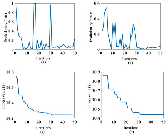 Figure 2 shows the evolutionary state and fitness in Case 1. Figure 2a,b show that the value of the early evolutionary factor is generally large before gradually shrinking. In addition, compared with Figure 2b–d, when the evolutionary factor is big enough, the fitness value remains unchanged. The reasons for the above phenomena are as follows: When is large enough, that is, close to 1, the current optimal individual is the farthest from all other particles, and the needs to be large enough to improve the search efficiency and speed up the convergence. When becomes very small, that is, close to 0, the current optimal individual is very close to all other individuals, that is, it tends to converge. At this time, to further improve the search efficiency and speed up, should be smaller.