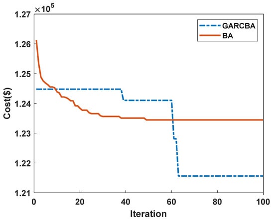 To further demonstrate the superiority of our proposed method, statistical results for cost and running time from 25 runs are provided in Table 4. The DARCBA’s minimum, median, maximum, and average costs are USD 10,179.52, USD 10,209.21, USD 10,297.29, and USD 10,234.96, respectively. All these values are smaller than the values obtained by the comparison algorithms. The DARCBA’s mean running time is 36.24 s; however, for the other three algorithms, the minimum mean running time is 40.84 s, which is given by PSO. Due to the effects of the GRNN based on the SAMP sampling strategy, our proposed method’s time is shorter than those of the other original algorithms. Moreover, the difference between the maximum and minimum costs of the GARCBA after 25 runs is only USD 177.77. This is because the ESE method can effectively improve the algorithm’s reliability, and the method of adaptively updating can improve the optimization performance.