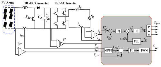 The block diagram of the MPPT method is shown in Figure 1, where Ipv and Vpv are the current and voltage measurements of the photovoltaic panel, respectively. Vref is a reference current provided by the algorithm for operating the arrangement at maximum power, which is compared with the operating current of the PV panel. The result of this comparison constitutes the input of a proportional integral (PI) controller that produces a modulation index of the PWM connected to the switching device of the boost converter connected to the photovoltaic array. In the double-stage PV system used in this work, the single-phase DC-AC inverter is responsible for both the voltage control of the DC bus and the current injected into the grid.