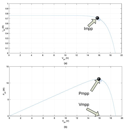The behavior of a photovoltaic panel is thus described by two characteristic curves, current-voltage and power-voltage. These curves are usually available from the PV manufacturer and are of great importance because their values change according to the temperature and radiation conditions. The characteristics of the voltage-power and voltage-current characteristic curves of a photovoltaic module are shown, respectively, in Figure 3a,b for radiation of 1000 W/m2 and a temperature of 25 °C.