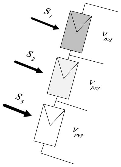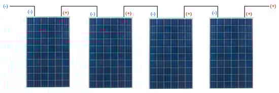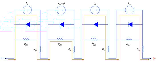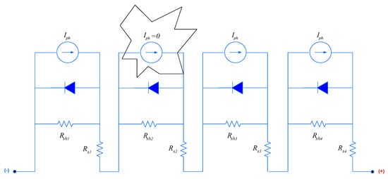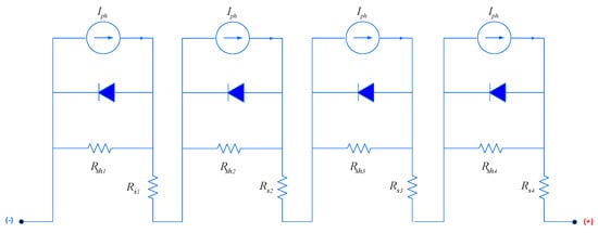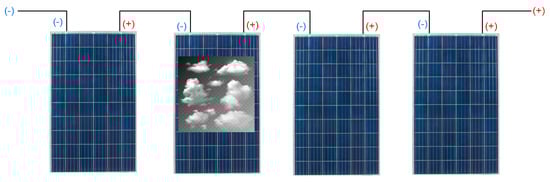 Continuing with the model of the equivalent circuit of the photovoltaic panel, the effect that partial shading has in photovoltaic systems is considered below. For this, four panels connected in series are shown (Figure 5). The four panels, seen as an equivalent circuit, are also shown in Figure 6. A photovoltaic module is partially shaded when it does not receive the total available irradiation in one or more modules in the chain. Some causes of this shading are trees, birds, snow, and buildings, among others.