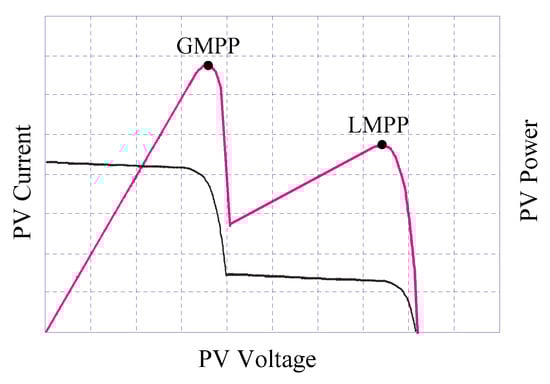 In Figure 10, a characteristic curve is represented when some of a module’s cells are shaded. The algorithm needs to be robust and efficient to be able to detect the maximum power point and prevent it from being in a top call place. Due to partial shading, the modules have different IV curves. When they are connected in series or parallel, different IV curves are superimposed, generating an IV curve with multiple inflections and, consequently, a PV curve with various maximum power points, as shown in Figure 10. Under the effect of PSC, the system has a considerable loss of control, which can become even more significant if it does not have a proper MPPT method.