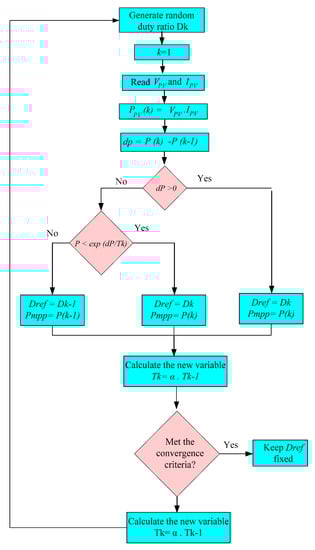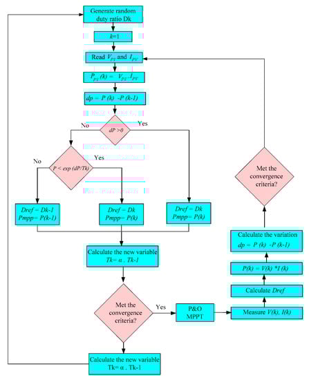 The SA-P&O algorithm uses the SA technique to reach a point close to the global maximum power point. Soon after finding it, the algorithm switches to the P&O method, which starts with referencing the best power point found defined by the SA method. Figure 13 shows the flowchart for this algorithm, the SA-P&O MPPT. Figure 13 shows the SA-P&O hybrid MPPT algorithm.