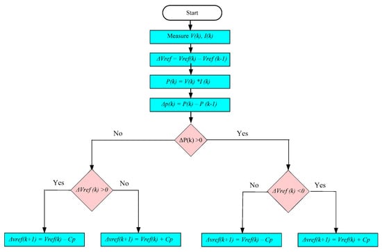 To deal with nonlinear phenomena and achieve system stability with MPPT, many approaches have been proposed in the literature, such as techniques with adapted constant voltage [], fuzzy logic [,,], neural Networks [,], perturbation and observation (P&O) [,,,], and incremental conductance [,,].