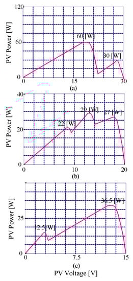 The MPPT algorithms were evaluated under two different operating conditions of the PV system. Figure 15a shows the first testing condition characteristic curves (case 1) of the PV module, Figure 15b shows the characteristic curves for case 2, and Figure 15c shows case 3. A transparent sheet covered parts of the PV array to simulate partial shading with different patterns in cases 1, 2, and 3.