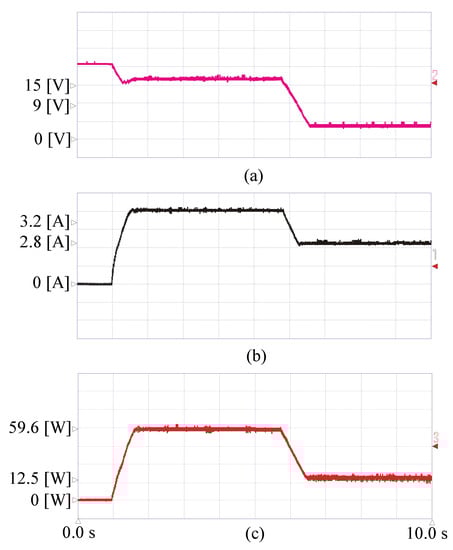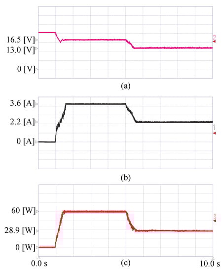 Experimental results of SA-P&O MPPT considering Case 3. (a) PV voltage, (b) PV current, and (c) PV power.