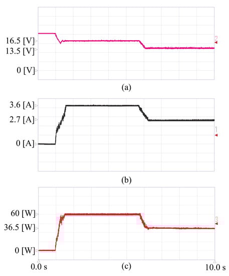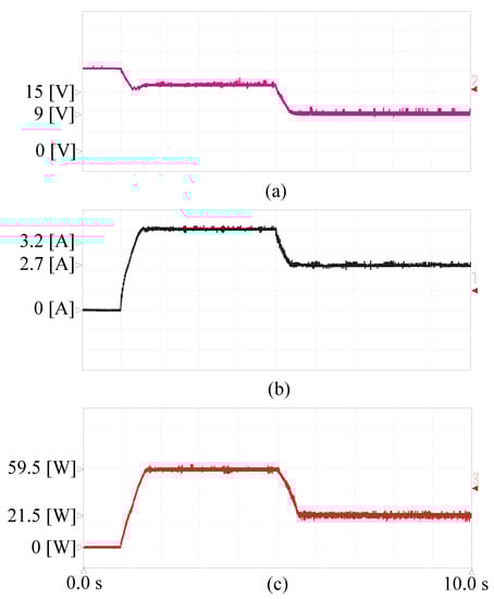 Experimental results of P&O MPPT considering Case 2. (a) PV voltage, (b) PV current, and (c) PV power.