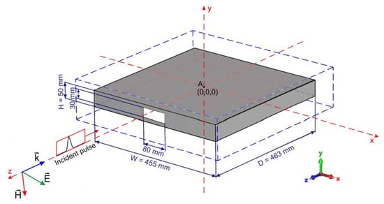 The dimensions of the computational area were x (−235 mm, + 235 mm), y (−32.5 mm, +32.5 mm), and z (−239 mm, +239 mm). The enclosure was placed symmetrically in the computational area marked in blue dashed lines (470 × 65 × 478 mm). The configuration of the computational area is illustrated in Figure 1. The computation area’s front plane is placed at z = +239 mm. The subnanosecond incident plane wave pulse propagates perpendicularly in the -z direction towards the front wall of the enclosure. It is assumed that the electric field strength vector of the incident pulse is directed in the +x direction (correspondingly, the magnetic field strength vector is directed in the −y direction).
