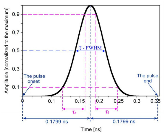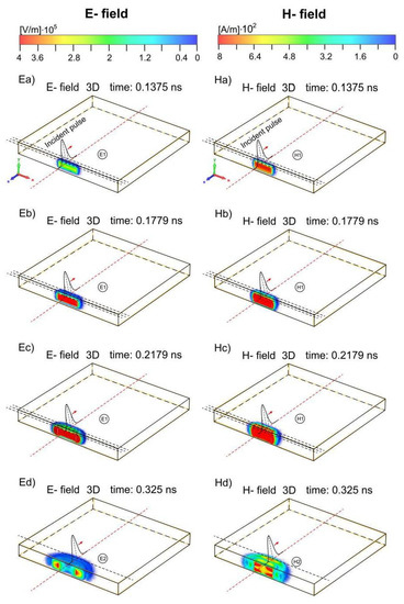 The incident pulse parameters are shown in Figure 2: the maximum electric field strength amplitude—106 V/m, the maximum magnetic field strength amplitude—2.68 × 103 A/m, the maximum pulse power density—2.68 GW/m2, time when the amplitude of the electric or magnetic field strengths reach their maximum values—tmax = 0.1779 ns, the full width at half maximum (FWHM) of the incident pulse—τ = 0.0804 ns, the pulse rise time—τr = 0.058 ns, the pulse fall time—τf = 0.058 ns.