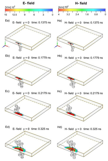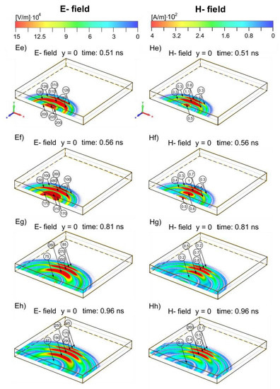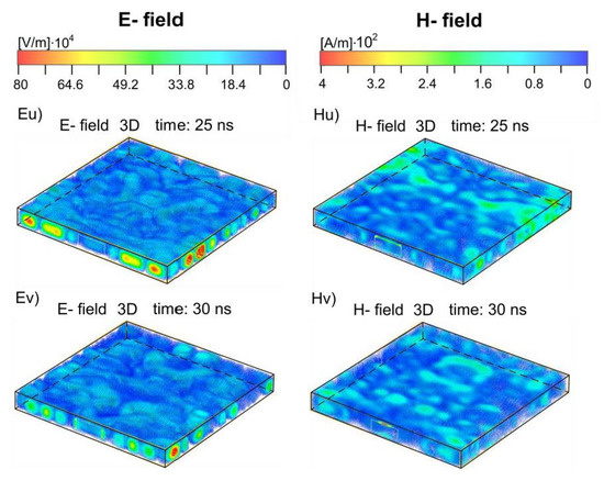 As already shown in Figure 9B, with elapsed time, when the incident pulse penetrated deeply into the enclosure, EM structures appear, which are more complex than the E1–E4 and H1–H4 structures presented so far. This is caused by new electric charge pairs (Qi+, Qi−), which also form on the inner side of the enclosure side walls. These new electric charge pairs (Qi+, Qi−) are clearly visible in Figure 5Ei (t = 1.400 ns)–5Ev (t = 30 ns). However, up to approximately t = 1.5 ns, i.e., before the reflection of the front of the electric and magnetic structures from the enclosure rear wall, we are still able to distinguish individual interference electric and magnetic structures (Figure 5Eg–Ej,Hg–Hj and Figure 6Eg–Ej,Hg–Hj). After the reflection, due to the interference of the electric and magnetic structures moving toward and from the enclosure rear wall, we deal with a complex time-varying EM field rather than with the individual electric and magnetic structures. After the time t = 3 ns (Figure 5Eo,Ho and Figure 6Eo,Ho), when the front of the EM field pattern first time reflected from the enclosure front wall, the EM field pattern has the form of time-varying interference areas of various shapes and sizes, which change with time. Additionally, the amplitudes of the electric and magnetic fields of these interference areas change with time. The whole EM field pattern, causing the interference areas, oscillates between the front and rear walls of the enclosure (Figure 5Ep–Ev,Hp–Hv and Figure 6Ep–Ev,Hp–Hv). It is seen from these figures that the time-varying and size-limited areas that form the EM field pattern are placed symmetrically with respect to the z-axis. The highest amplitudes of the electric and magnetic fields occur in those interference areas which lie on the z-axis.