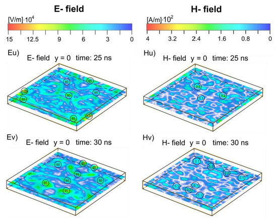 Figure 5 visualizes the three-dimensional (3D) temporal and spatial development of the electric and magnetic fields in the apertured enclosure from the time t = 0 when the onset of the incident plane wave pulse reaches the front plane of the enclosure to the time t = 30 ns, i.e., when the incident HPEM pulse passed the enclosure and, being far from it, stopped affecting it. In Figure 5, the position of the incident EM plane wave pulse vs time is indicated on the upper wall of the enclosure. The temporal and spatial development of the electric field is shown in the left column, and that of the magnetic field in the right column. Other details of the enclosure’s electric and magnetic field evolution can be found in the two-dimensional (2D) Figure 6, and also in the vector maps for several cross-sections of the enclosure’s interior (Figure 7, Figure 8, Figure 9 and Figure 10).