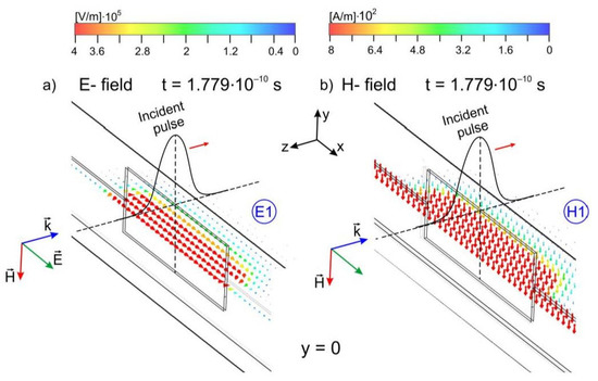 Associated electric E1 (a) and magnetic H1 (b) field structures in the plane xz (y = 0) at t = 0.1779 ns (i.e., when the incident pulse maximum passes the enclosure front wall plane). Vector shows the propagation direction of the EM incident pulse. Retrieved from Figure 6Eb,Hb.