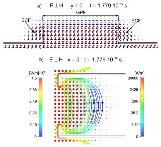 Figure 7a,b shows separately the associated electric and magnetic vector fields in the y = 0 at the time t = 0.1779 ns. This is the time the incident pulse maximum passes the enclosure front wall plane. The electric vector field, shown in Figure 7a, consisting of GPF and ECF1, is the first interference structure E1. The electric field vectors of the structure E1 lie in the plane y = 0 (i.e., in the same plane as those of the incident pulse). However, the electric field vectors, which can be assigned to GPF, point to the +x direction, while those corresponding to ECF are perpendicular or oblique to the +x direction. In the plane y = 0, the magnetic field vectors, forming the first interference structure H1, are directed in the −y direction, similarly to those in the incident pulse.