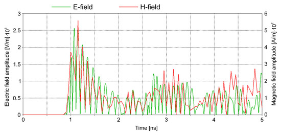 It is easy to see from Figure 5 and Figure 6 that the amplitudes of the electric and magnetic fields change with time at each point of the enclosure, when the time-varying EM field pattern appears between the front and rear walls of the enclosure. This is demonstrated in Figure 10, which shows the time dependence of the electric and magnetic fields at the central point A (0,0,0). It is seen from Figure 10, that the electric and magnetic fields at point A appear in the form of subnanosecond EM pulses, which we call the internal EM pulses. The internal EM pulse results from the corresponding EM area passing through point A (the first internal pulses of the electric field corresponding to the substructures S1–S4 belonging to the structure E4—Figure 4). The amplitudes of the internal pulses are lower than those of the incident EM pulse. The amplitudes of the first internal pulses are about 2 × 105 V/m and 400 A/m for the electric and magnetic fields, respectively. They decrease non-monotonic with time to about 0.7 × 105 V/m and 200 A/m at t = 5 ns.