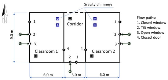 The ventilation model took into account airflow through leaks in the building envelope and ventilation achieved through opening windows. In each classroom, two gravity chimneys were modeled (Figure 3). The airflow was calculated by taking into account the variable indoor temperature calculated in the EP program. The following airflow element types was taken into account: