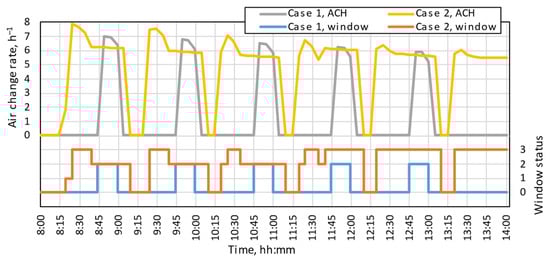 The designed controller, which optimized the window opening by considering indoor environment objective functions and using the genetic algorithm, made significant changes in the window opening and, consequently, CO2 concentration and indoor temperature. The changes were displayed for window status, air change rate, CO2 concentration, and indoor operative temperature on a special day (March 6). March 6 was selected as the coldest day that the controller could open the window in all options (tilt, open, tilt and open). Figure 4 shows that by using the optimized controller (Case 2), the window opened for a longer time than in Case 1. In addition, the window opening increased as the end of lecture time approached. Thus, in some hours, windows were both tilted and fully opened, while in Case 1, the controller opened the window (fully open) for 15 min constantly until the end of the students’ presence in the classroom.