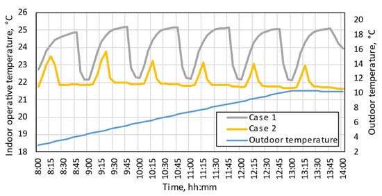 According to Figure 5, the outdoor temperature on March 6 varied between 3 and 10 °C. Therefore, window opening resulted in a decrease in indoor temperature. In case 1, despite temperature fluctuations with a larger range than in Case 2, the indoor operative temperature was higher than in Case 2 at all hours.