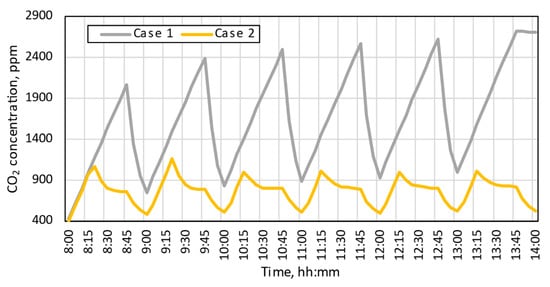 The effect of the optimized controller on the reduction in CO2 concentration on 6th March was investigated. Figure 6 shows that in case 1, the CO2 concentration at the end of each class, before the break time, reached the peak value and passed 2500 ppm. Meanwhile, after optimizing the controller with indoor environment quality functions, the CO2 concentration varied between 600 ppm and 1200 ppm. Therefore, using the optimized controller was very effective in reducing CO2 concentration.