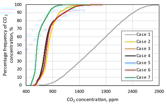 Figure 7 presents the cumulative distribution of CO2 concentration in the classroom (only occupied time). Considering that in Case 1, the window was opened only during breaks without considering the optimization of objective functions, the CO2 concentration increased to 2900 ppm. Solutions applied in Cases 2 to 6 performed relatively similar, but substantially better than Case 1. In these cases, for 80% of the time when students were in the classroom, the CO2 concentration was between 400 ppm and 950 ppm. In Case 7, as the number of students was reduced to 15, more than 90% of the students’ attendance time had a concentration of less than 900 ppm.