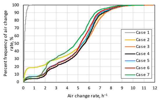 The air change rate (ACH) is the second investigated parameter that affects CO2 concentration and the indoor air quality. Figure 8 shows the distribution of ACH values based on time (only occupied time). As for CO2 concentration, except for Case 1, other cases had similar performance. In Case 1, at all the times when students were in the classroom, the ACH value was less than 1 h−1. In contrast, the air change rate in Cases 2 to 7 had significant fluctuations, reaching up to 12 h−1 in some hours.
