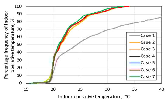 According to Figure 9, the indoor operative temperature in the classroom in Case 1 for 30% of the time was above 30 °C. This was due to the fact that the windows stayed closed during the classes and were opened only during breaks, even in September and June, when it was warm outside. In practice, during these periods in classrooms, windows are usually also open during lessons, which significantly reduces the indoor temperature. In the theoretical case, when there are 30 occupants in the room and the windows are closed, the temperature due to internal heat gains and solar gains may even exceed 40 °C. In Cases 2 to 7 (windows can be opened during lessons), for approximately 70% of the time when students were in the classroom, the temperature was between 20 and 25 °C.