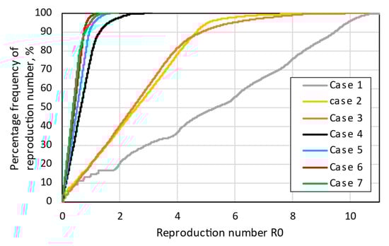 To evaluate if the proposed controller reduces the infection risk in addition to improving the indoor environment, it was necessary to investigate the reproduction number (R0) distribution during classes, i.e., in the students’ presence time. According to Figure 10, the use of the window opening controller reduced the probability of infection risk to some extent. In Case 1, the distribution of R0 was close to linear from 0 to 11. The reproduction values also reached 11 in Case 2, but for 90% of the time, R0 was less than 5. In Case 3, despite the optimization of the window controller considering the probability of infection transmission, no specific change in the R0 distribution was observed. In Cases 4 to 7, the improvements were clearly obvious. The reproduction number did not exceed 2 and, most of the time, it was smaller than 1 in Cases 5 to 7.
