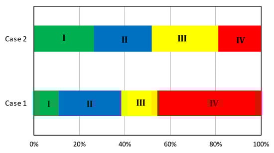 Previous studies suggested that the use of controllers is effective on thermal comfort, and their proper usage makes a substantial improvement in the overall thermal comfort of occupants []. Based on European standards [], there are different expectation levels of the building’s occupants from the indoor air environment including “High”, “Medium”, and “Moderate”, which are placed in three categories []. A normal level could be medium, and a high level may be used for special occupants such as children or old persons. As a lower level will not provide any health risk, this study used the moderate level of expectation (category III) for controller optimization to be able to cover all the objective functions. Case 1, in which one window sash was fully opened during each break, did not provide thermal comfort conditions in the classroom. Figure 11 demonstrates that annually, 44% of the time when students were in the classroom are out of the recommended thermal comfort categories range (IV), including 39% of the time when the room was overheated due to high operative temperature in warmer periods, as described in Section 3.2. In Case 2 where the window opening was controlled by indoor environment quality functions (thermal comfort and CO2 concentration), only 18% of the total time occupants were present in the classroom was outside the recommended categories of thermal comfort. During the lesson (i.e., during the time when internal heat gains occurred), the classroom was passively cooled by the outside air supplied through the open window. The window was opened for 25% of the time of the school season, in contrast to Case 1 where it was only 3% (always during breaks). In addition, 26% of the occupied time was placed in the highest level of expectation (category I), while in Case 1, only 10% of the time fell in the first category. As Cases 3 to 7 had a very similar performance to Case 2, they were omitted in Figure 11.